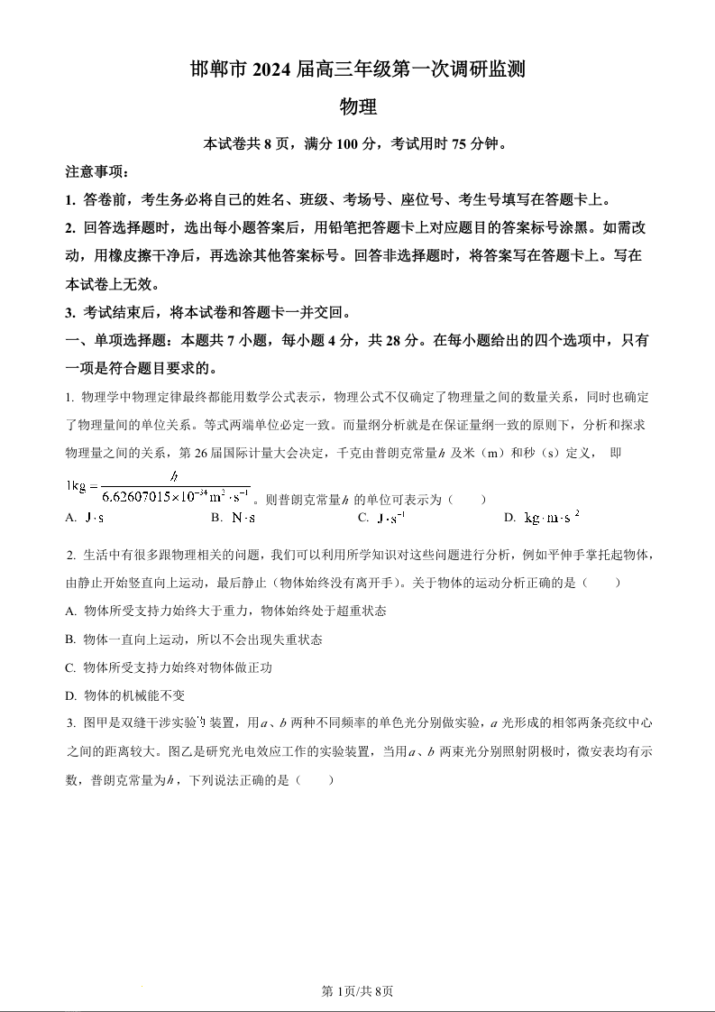 河北省邯郸市2024届高三上学期第一次调研监测物理(原卷版)