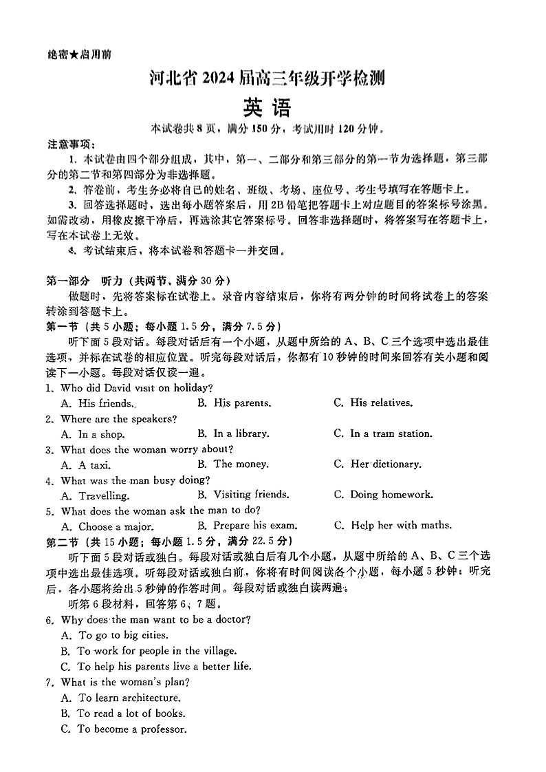 河北省秦皇岛市2024届高三年级开学检测英语