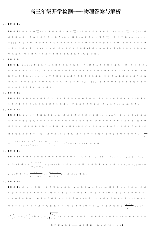 河北省秦皇岛市2024届高三年级开学检测物理答案