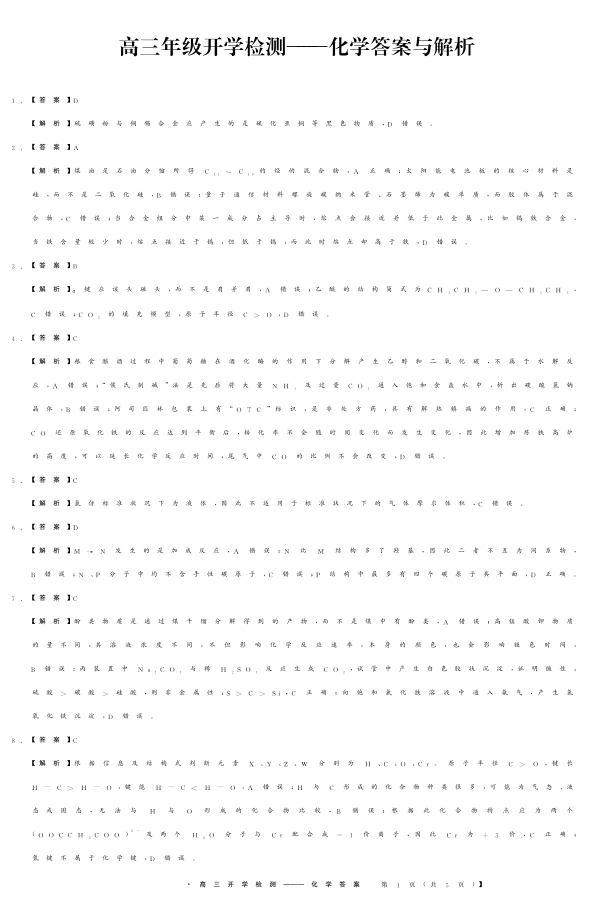 河北省秦皇岛市2024届高三年级开学检测化学答案