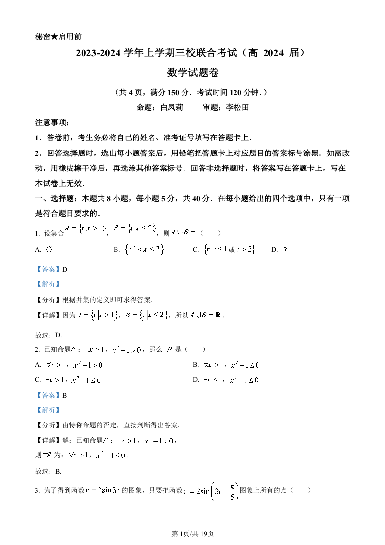 重庆市铜梁一中等三校2024届高三上学期10月联考数学(精品解析版)