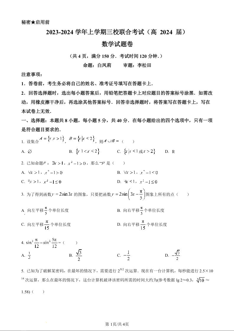 重庆市铜梁一中等三校2024届高三上学期10月联考数学(原卷版)