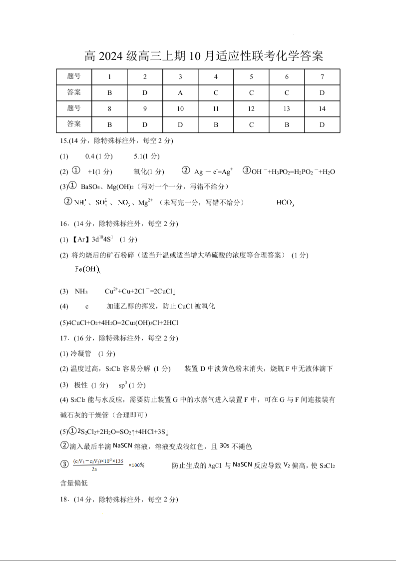 重庆市铜梁一中等三校2024届高三上学期10月联考化学答案