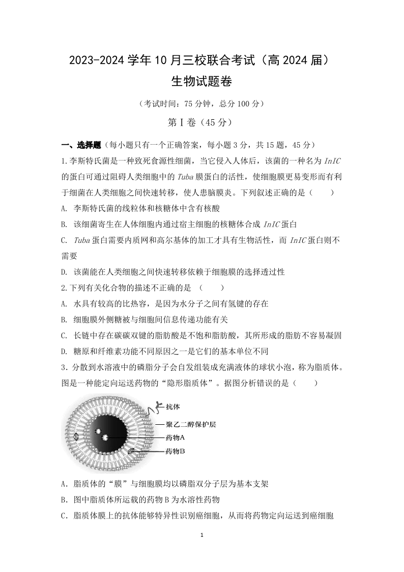 重庆市铜梁一中等三校2024届高三上学期10月联考生物