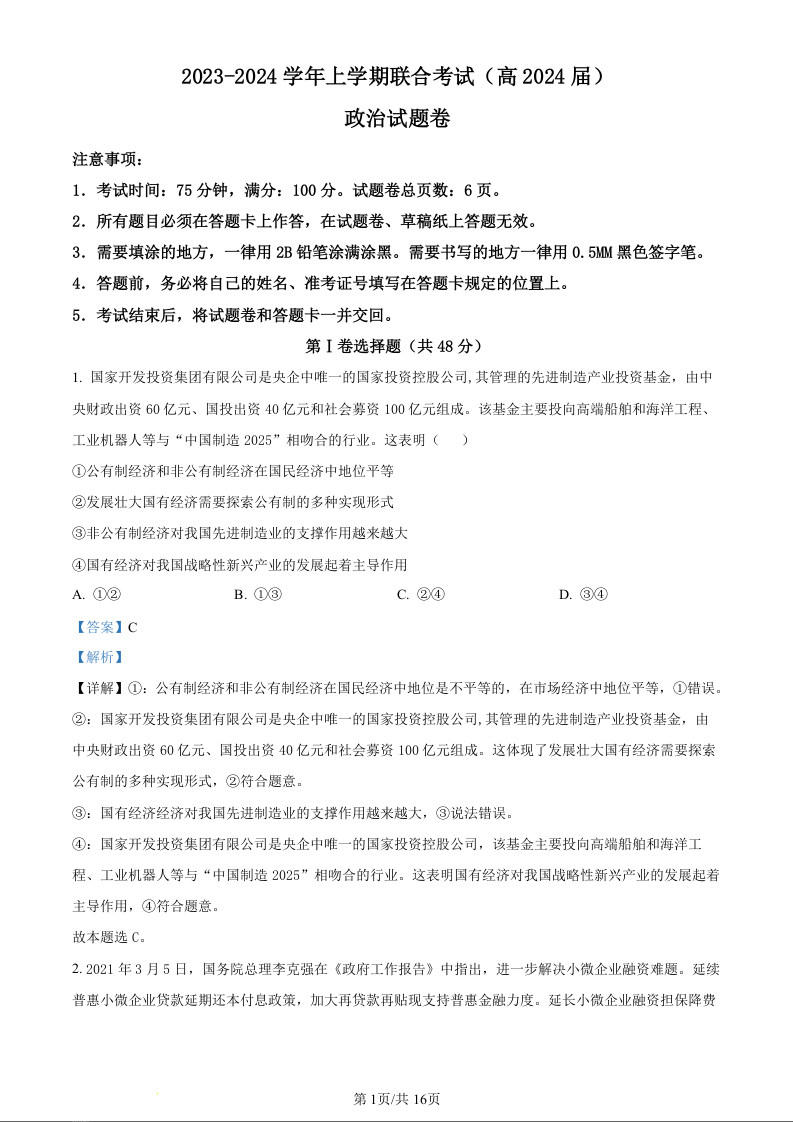 重庆市铜梁一中等三校2024届高三上学期10月联考政治(精品解析版)