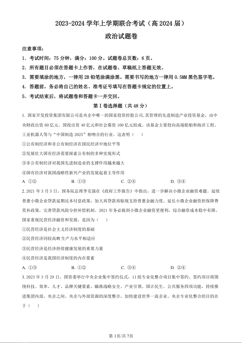 重庆市铜梁一中等三校2024届高三上学期10月联考政治(原卷版)