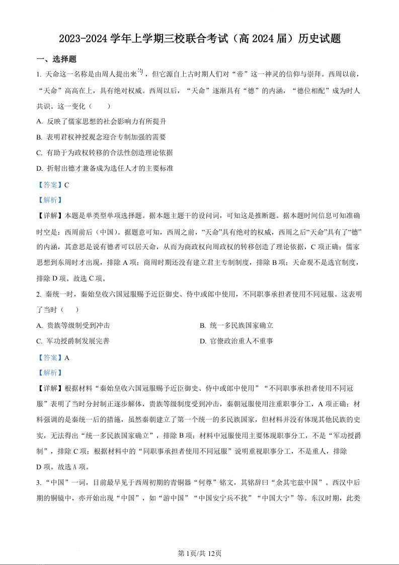 重庆市铜梁一中等三校2024届高三上学期10月联考历史(精品解析版)