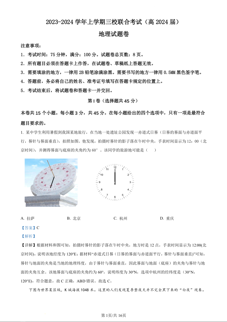 重庆市铜梁一中等三校2024届高三上学期10月联考地理(精品解析版)