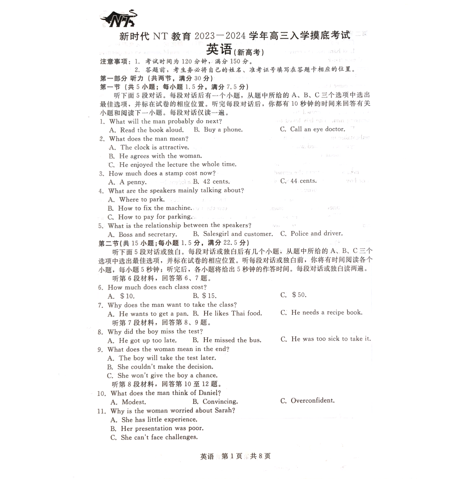 河北省新时代NT教育2024届高三入学摸底考试英语