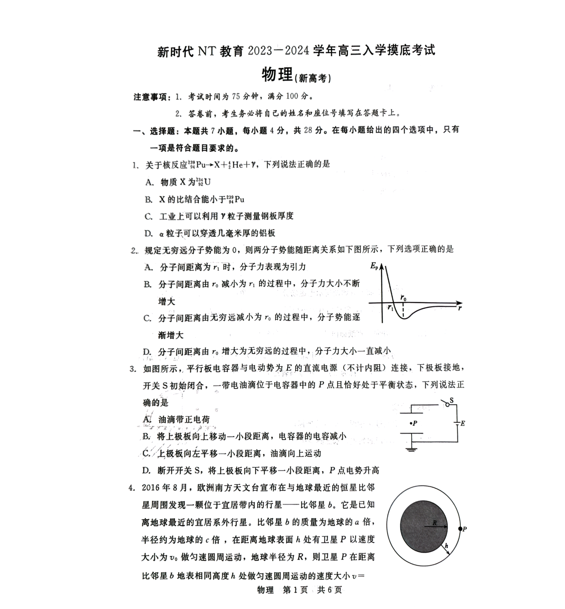 河北省新时代NT教育2024届高三入学摸底考试物理