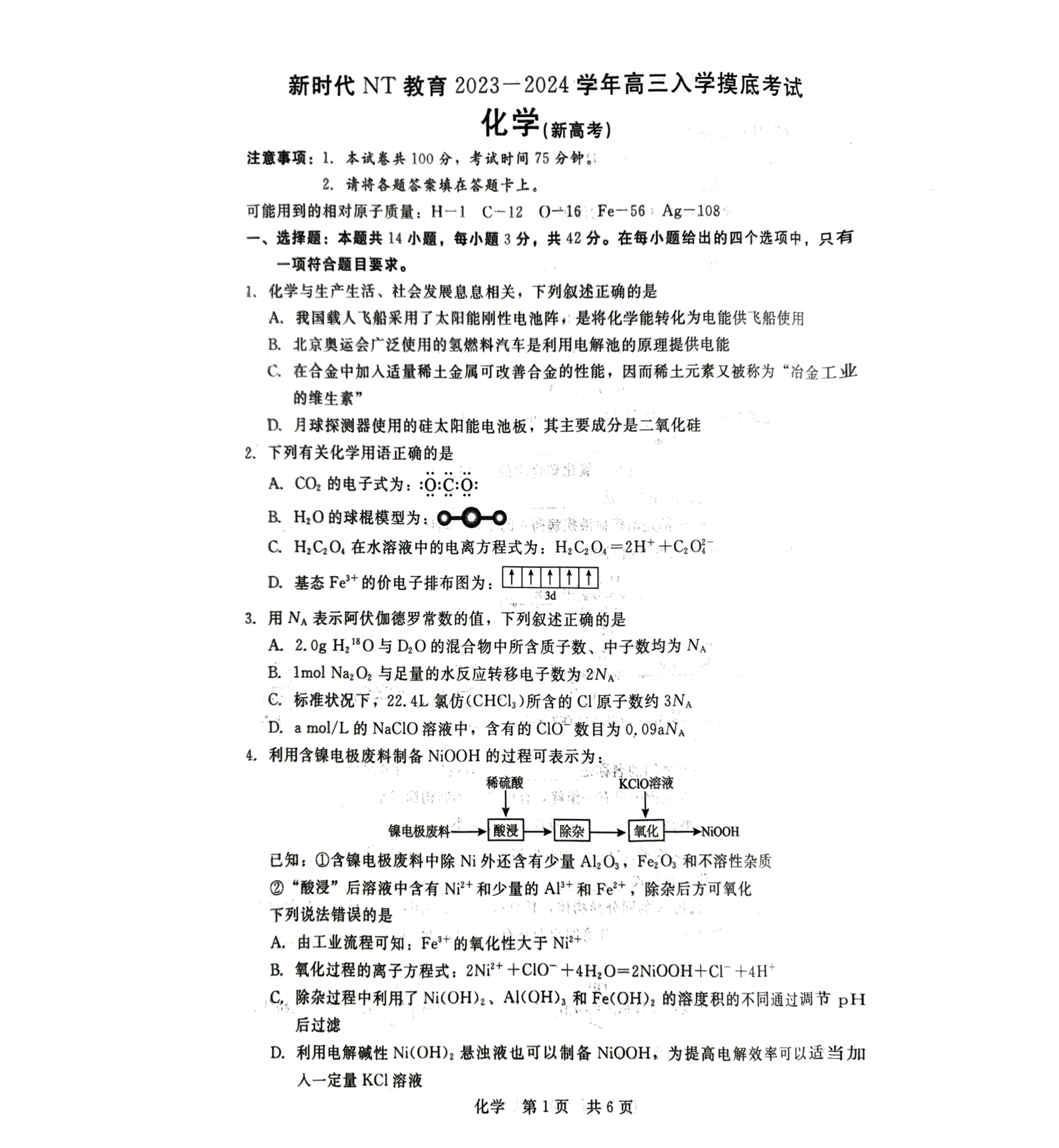 河北省新时代NT教育2024届高三入学摸底考试化学
