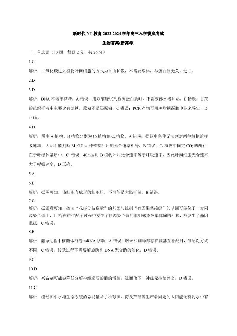 河北省新时代NT教育2024届高三入学摸底考试生物答案