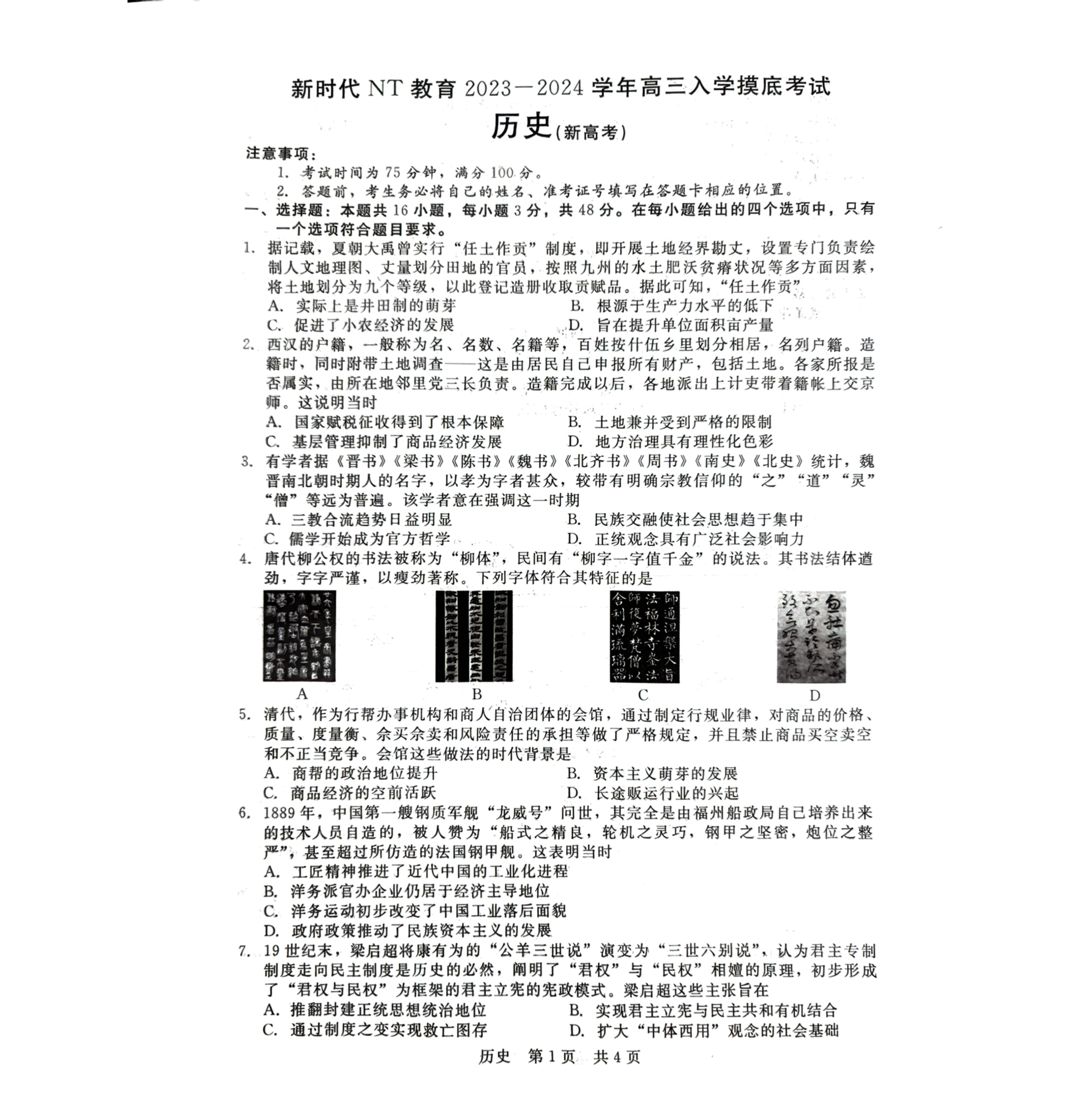 河北省新时代NT教育2024届高三入学摸底考试历史