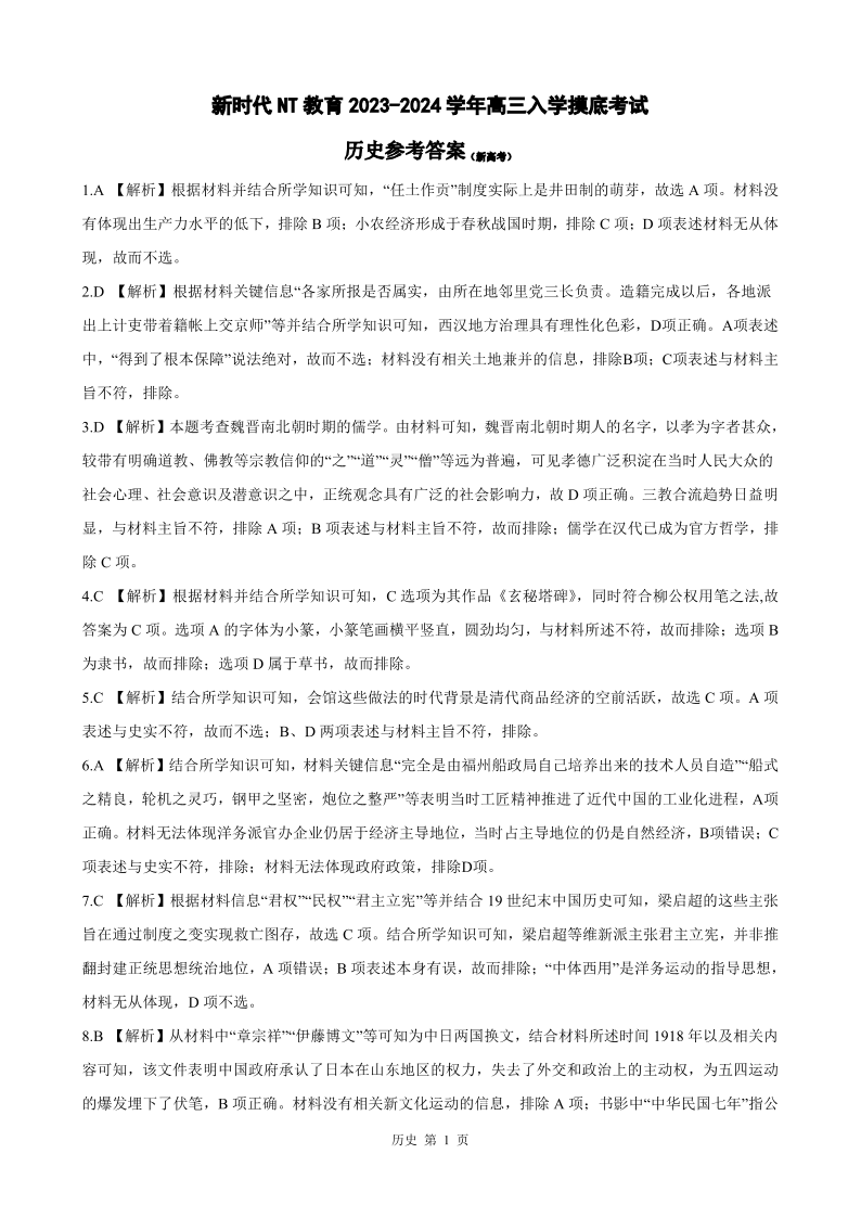 河北省新时代NT教育2024届高三入学摸底考试历史答案