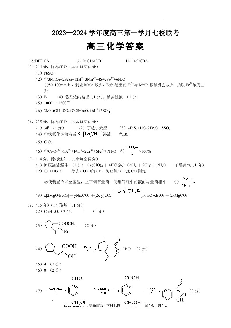 重庆市七校2024届高三上学期第一次月考化学答案
