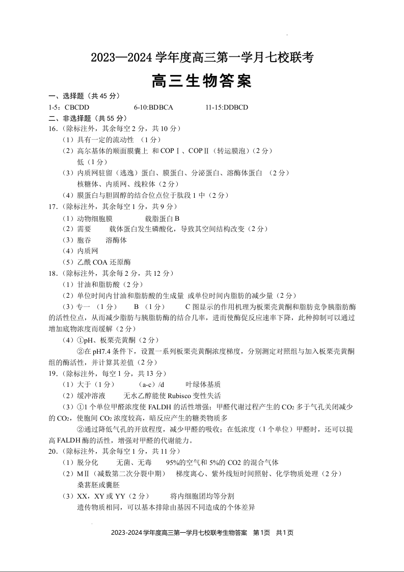 重庆市七校2024届高三上学期第一次月考生物答案