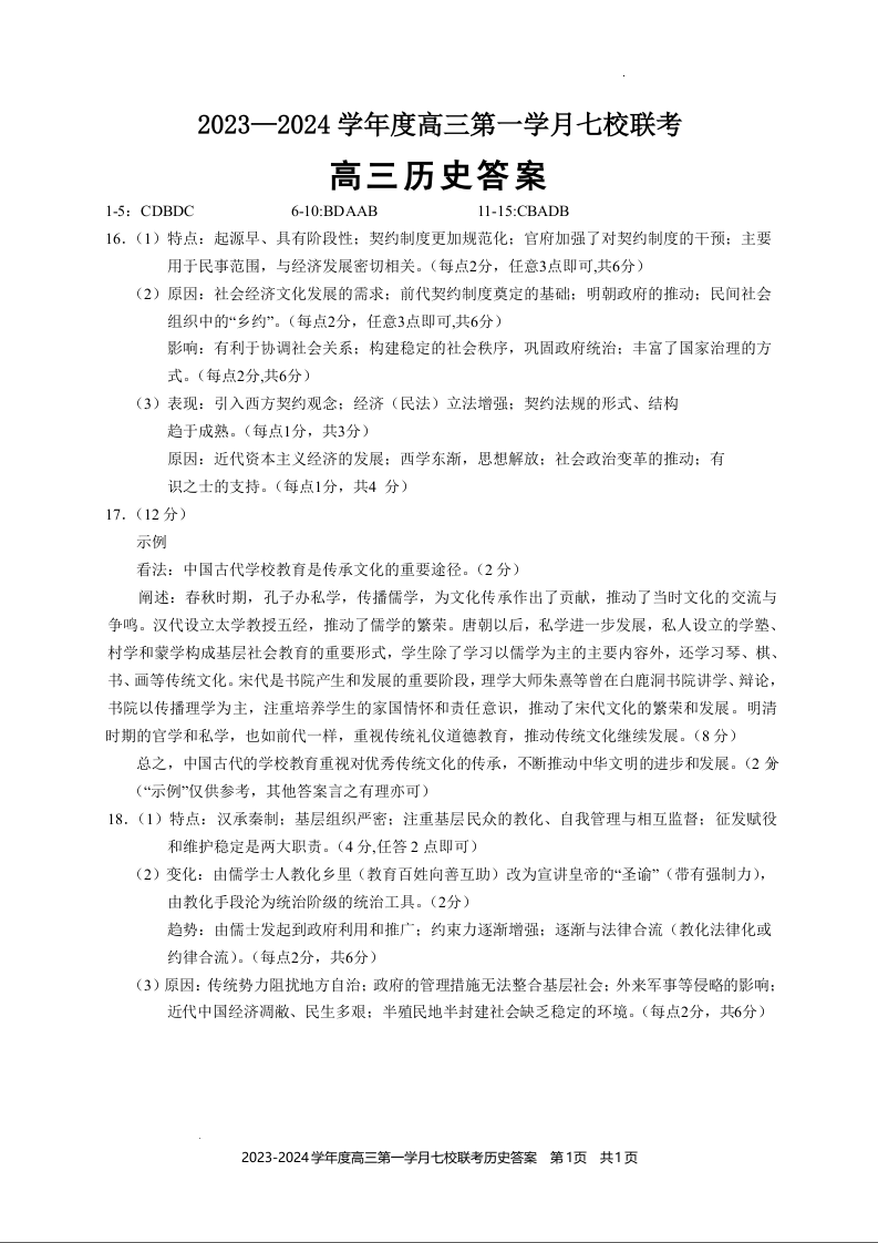 重庆市七校2024届高三上学期第一次月考历史答案
