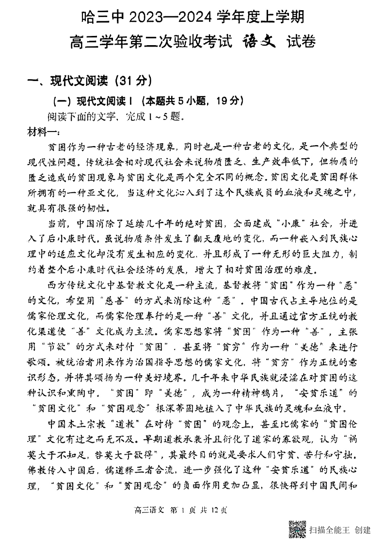 黑龙江哈尔滨第三中学2024届高三上学期第二次验收考试语文