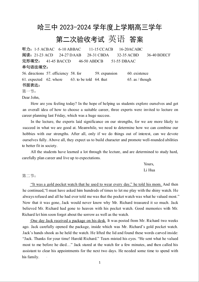 黑龙江哈尔滨第三中学2024届高三上学期第二次验收考试英语答案