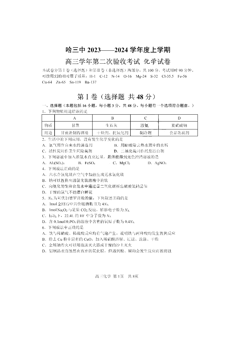 黑龙江哈尔滨第三中学2024届高三上学期第二次验收考试化学
