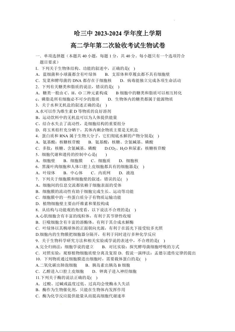 黑龙江哈尔滨第三中学2024届高三上学期第二次验收考试生物+答案