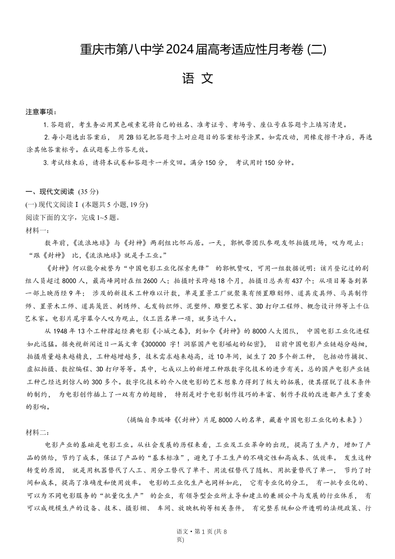 重庆市第八中学2024届高考适应性月考卷(二)语文