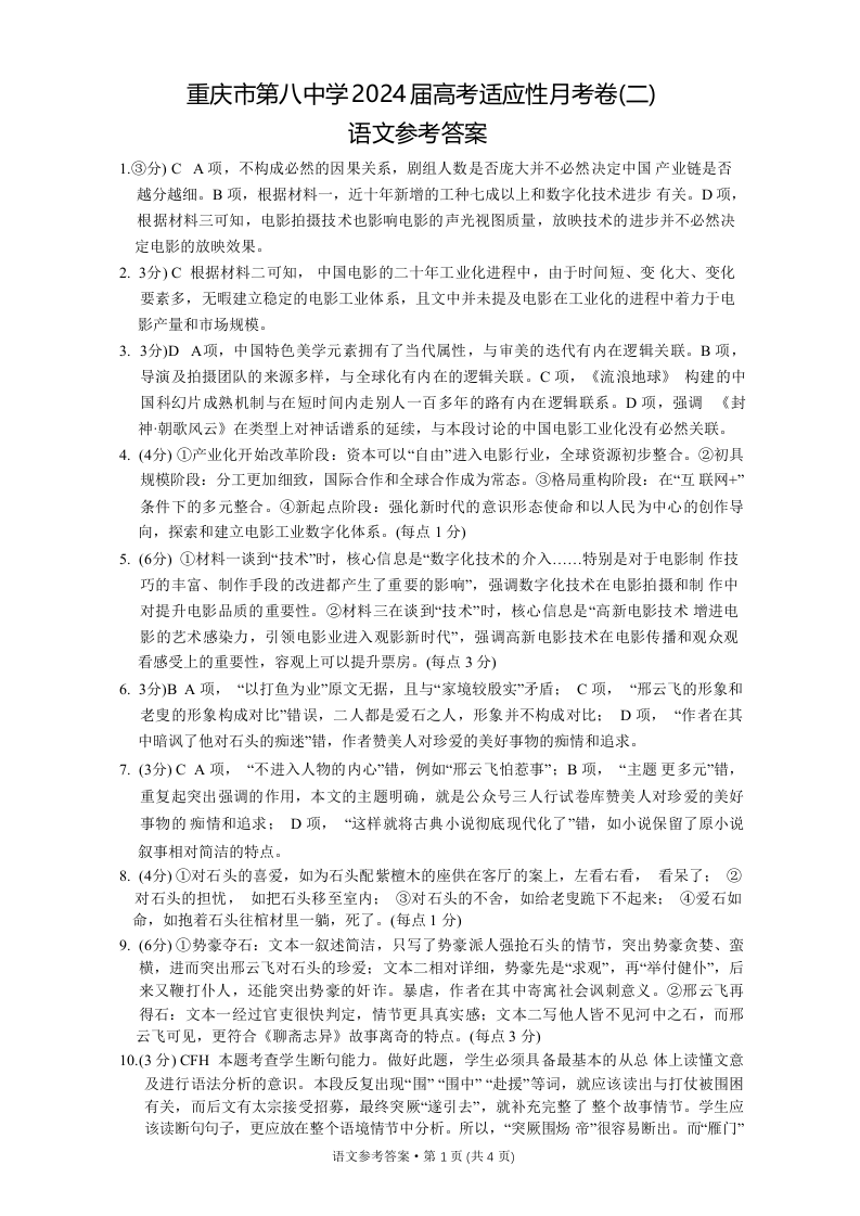 重庆市第八中学2024届高考适应性月考卷(二)语文答案