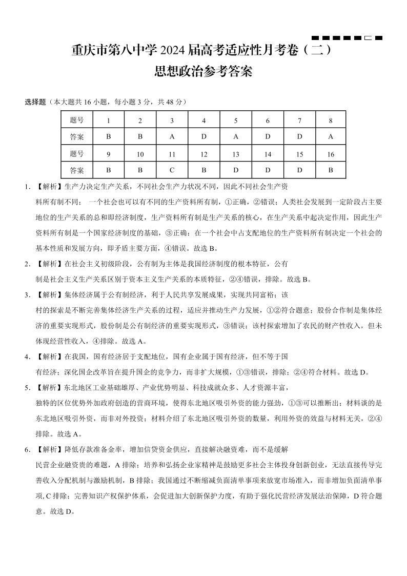 重庆市第八中学2024届高考适应性月考卷(二)政治答案