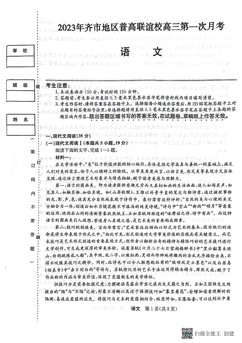 黑龙江省齐齐哈尔市联谊校2024届高三上学期9月月考语文