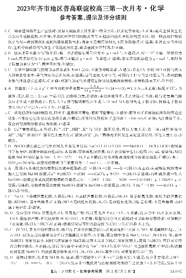 黑龙江省齐齐哈尔市联谊校2024届高三上学期9月月考化学答案