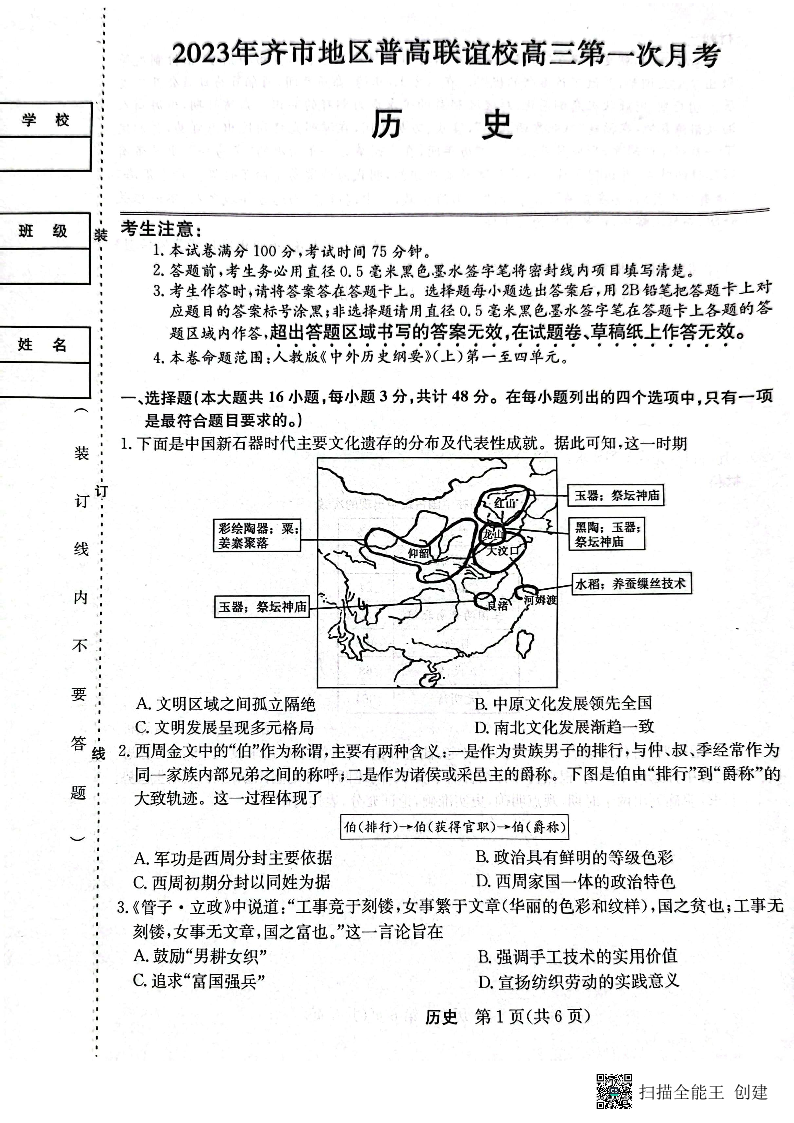 黑龙江省齐齐哈尔市联谊校2024届高三上学期9月月考历史