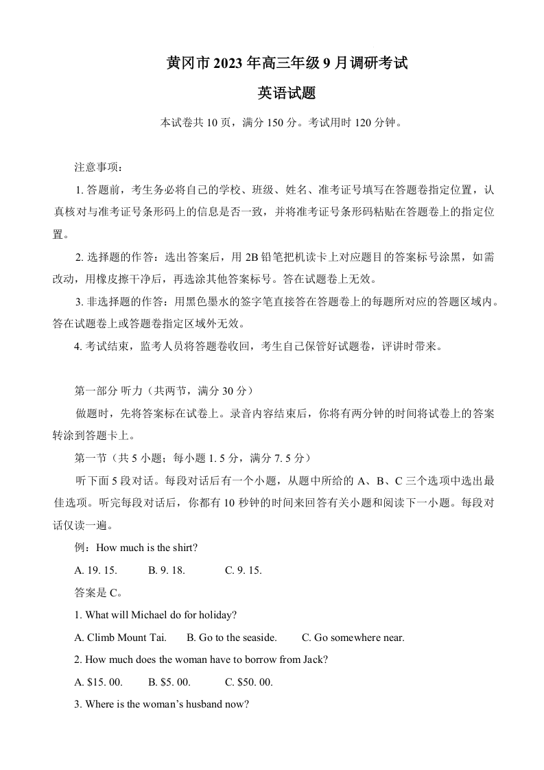 湖北省黄冈市2024届高三上学期9月调研考试英语