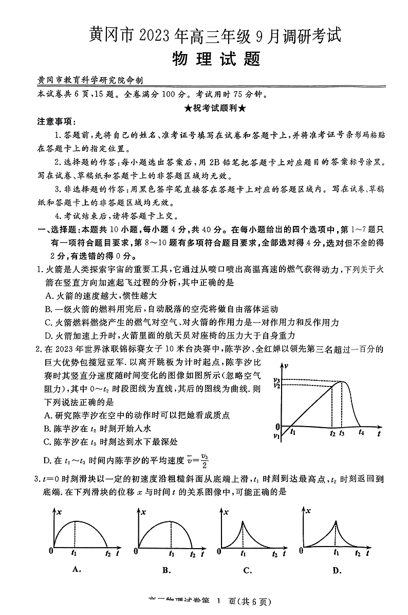 湖北省黄冈市2024届高三上学期9月调研考试物理