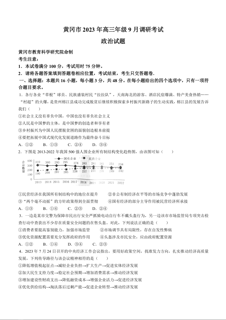 湖北省黄冈市2024届高三上学期9月调研考试政治+答案