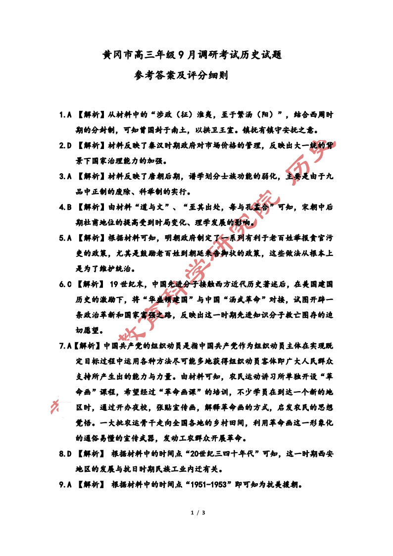湖北省黄冈市2024届高三上学期9月调研考试历史答案
