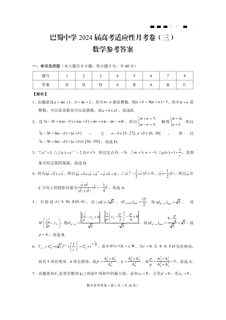 重庆巴蜀中学2024届高三适应性月考(三)数学答案
