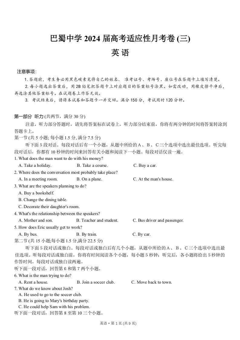 重庆巴蜀中学2024届高三适应性月考(三)英语