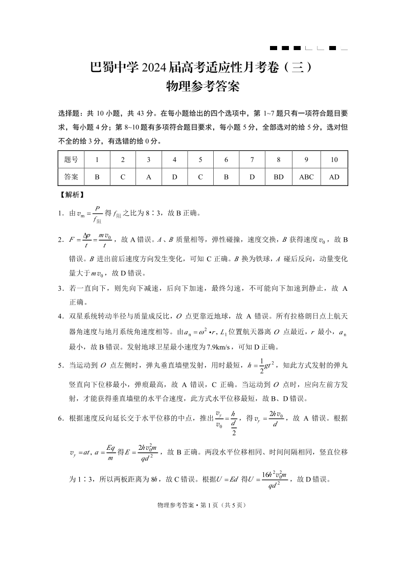重庆巴蜀中学2024届高三适应性月考(三)物理答案