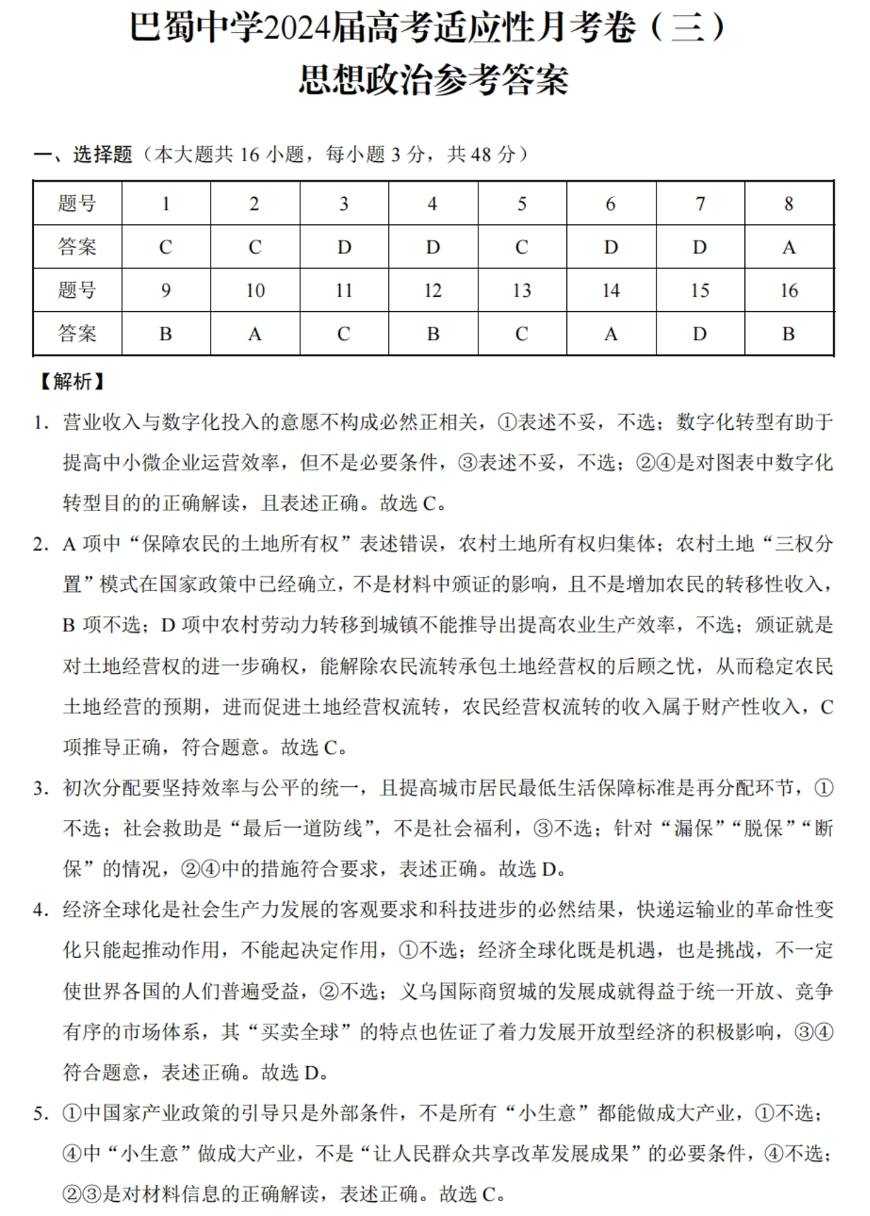 重庆巴蜀中学2024届高三适应性月考(三)政治答案