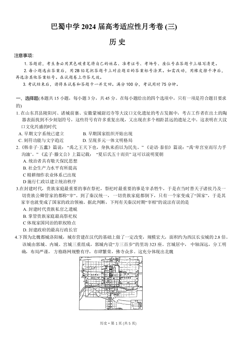 重庆巴蜀中学2024届高三适应性月考(三)历史