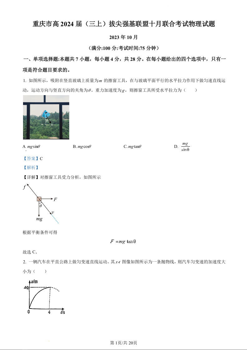 重庆育才中学西南大学附中高2024届拔尖强基联盟高三十月联合考试物理(精品解析版)