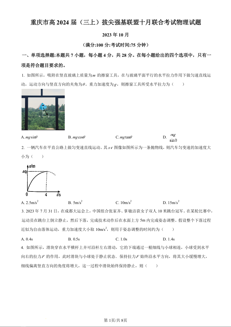 重庆育才中学西南大学附中高2024届拔尖强基联盟高三十月联合考试物理(原卷版)