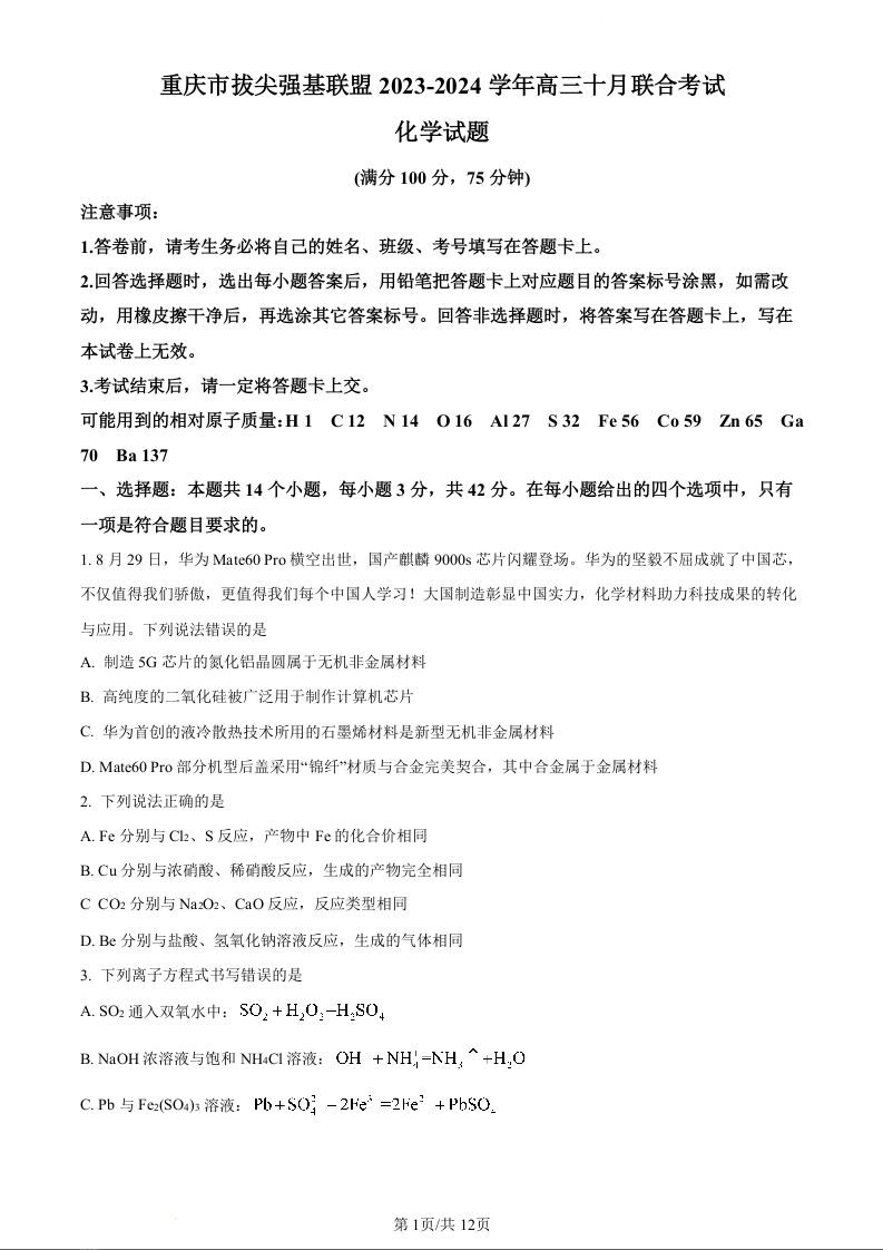 重庆育才中学西南大学附中高2024届拔尖强基联盟高三十月联合考试化学(原卷版)