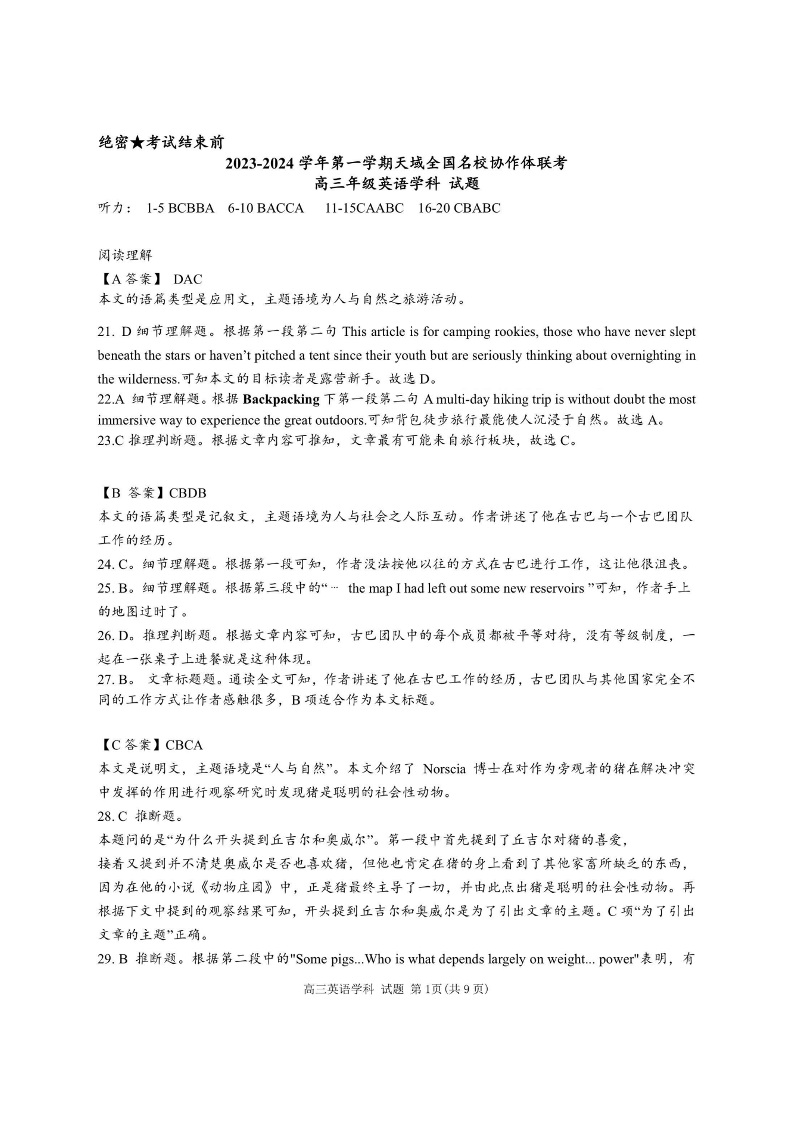 浙江省2024届第一学期天域全国名校协作体联考英语答案