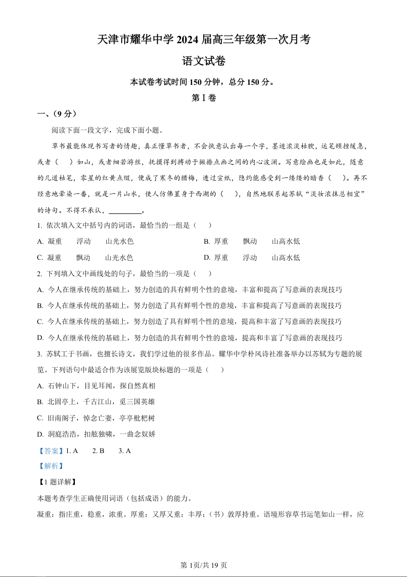天津市耀华中学2024届高三上学期10月月考语文(解析版)