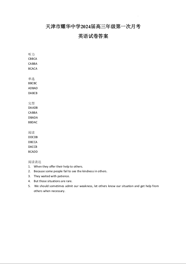 天津市耀华中学2024届高三上学期10月月考英语答案