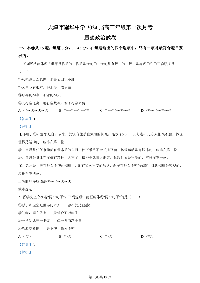 天津市耀华中学2024届高三上学期10月月考政治(精品解析版)