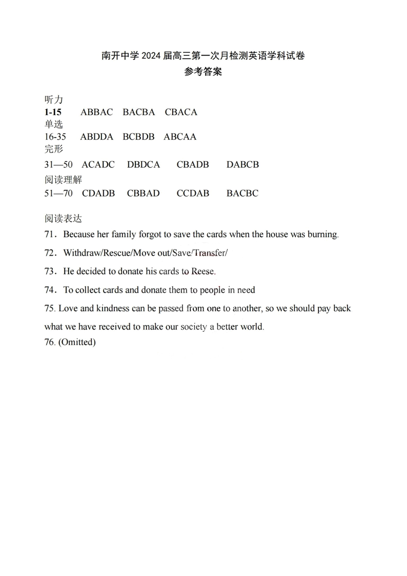 天津市南开中学2024届高三上学期第一次月考英语答案
