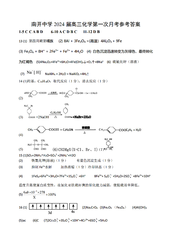 天津市南开中学2024届高三上学期第一次月考化学答案