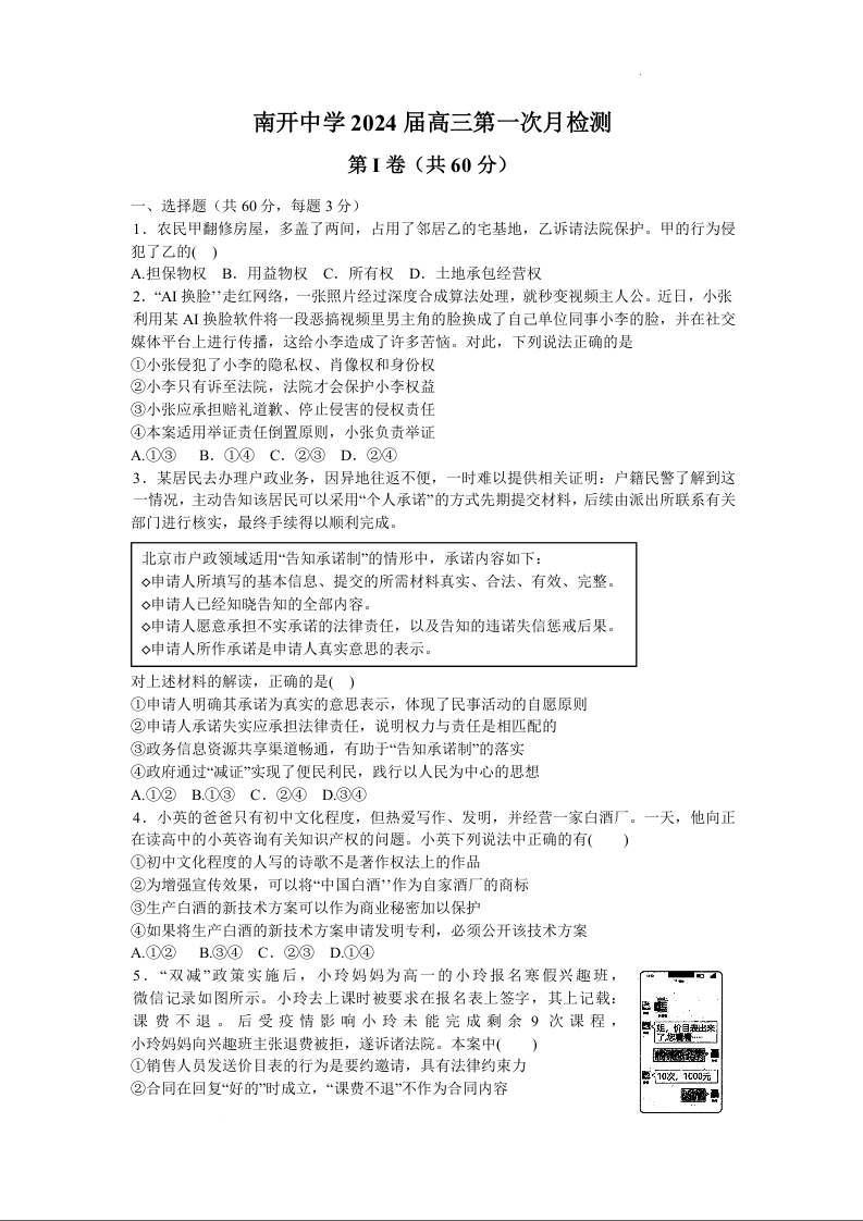 天津市南开中学2024届高三上学期第一次月考政治+答案